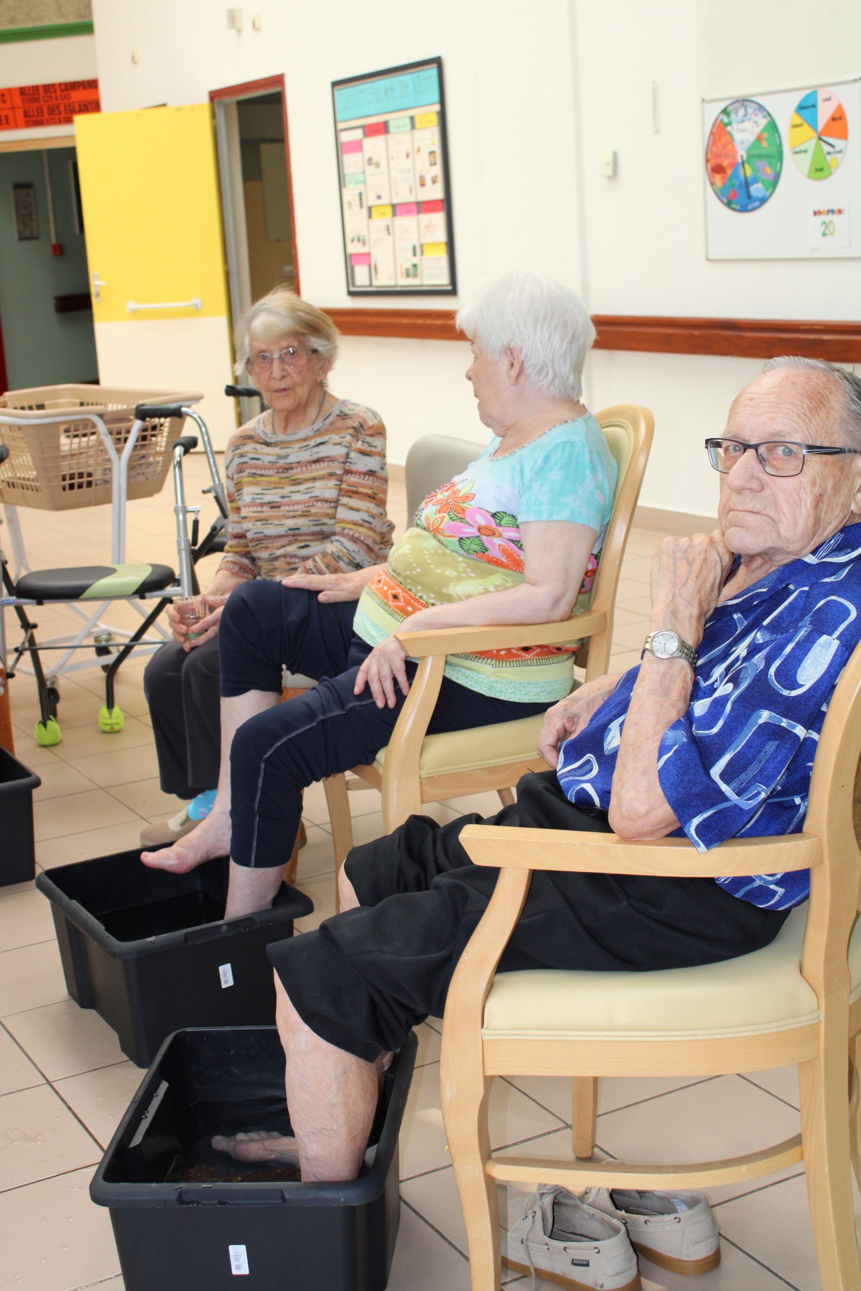 Ce mercredi matin, un temps « détente et bien-être » a accompagné le temps d’hydratation. Les résidents ont pu savourer un bain de pieds dans une ambiance sereine et calme. Huile essentielle de lavande, musique douce et eau fraîche à volonté, ce fut un réel moment de plaisir, à refaire assurément !