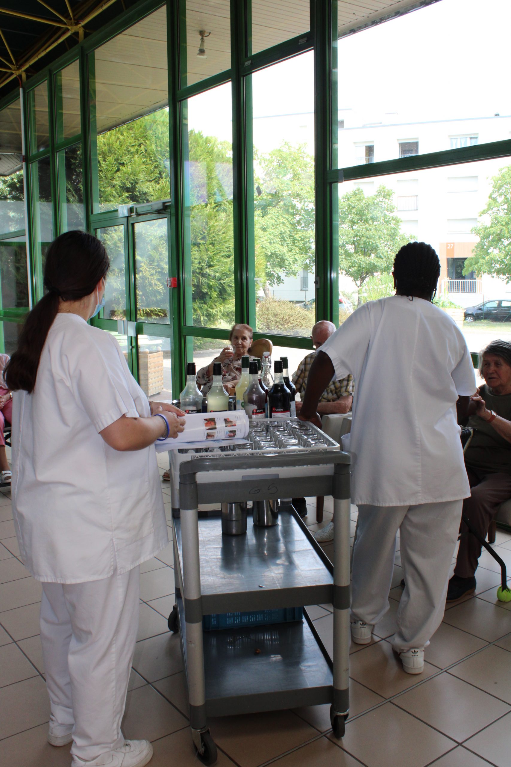 Des porteurs d’eau circulent dans tout l’établissement afin de proposer des boissons fraîches à tous nos résidents tout au long de la journée.