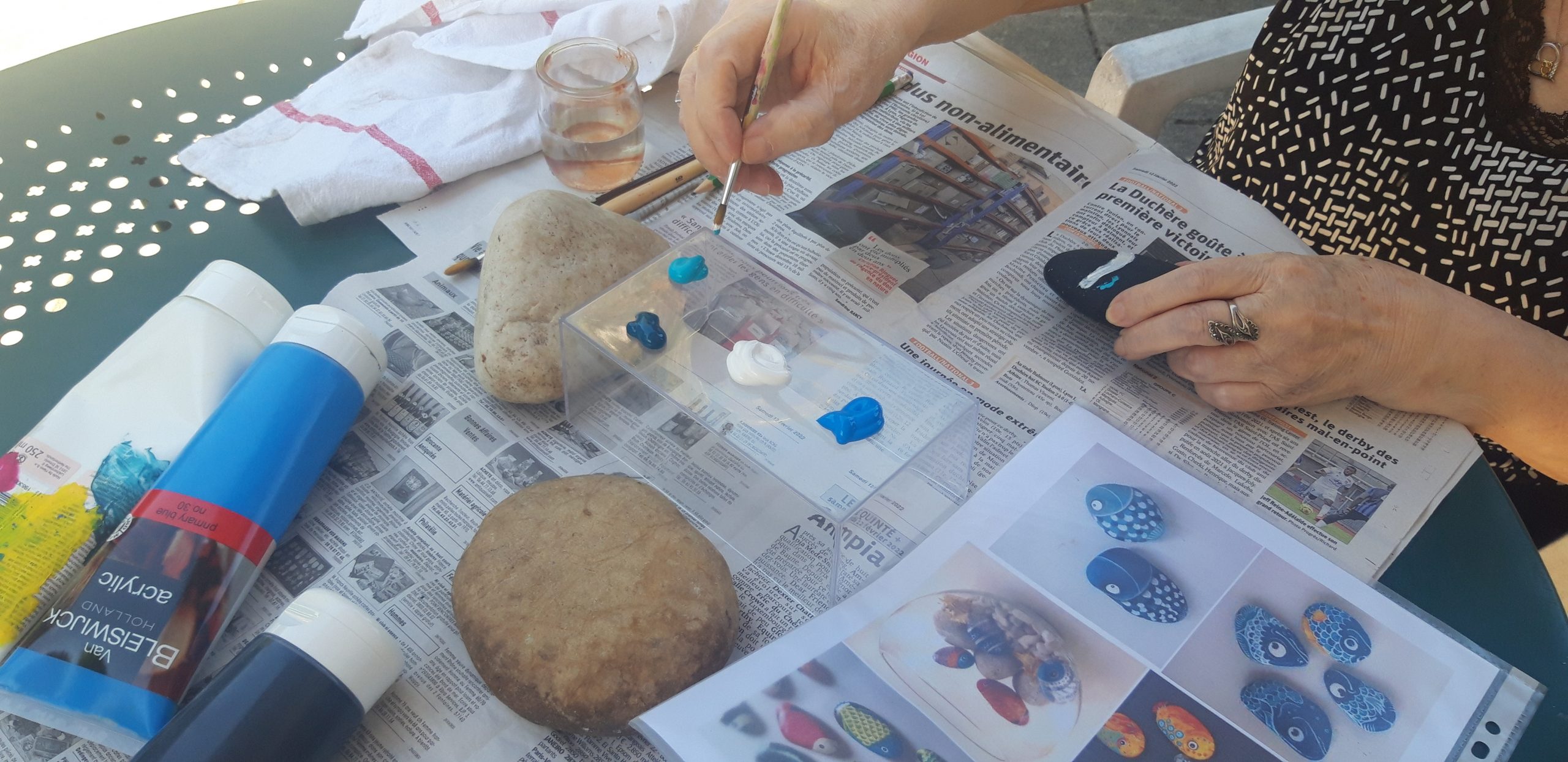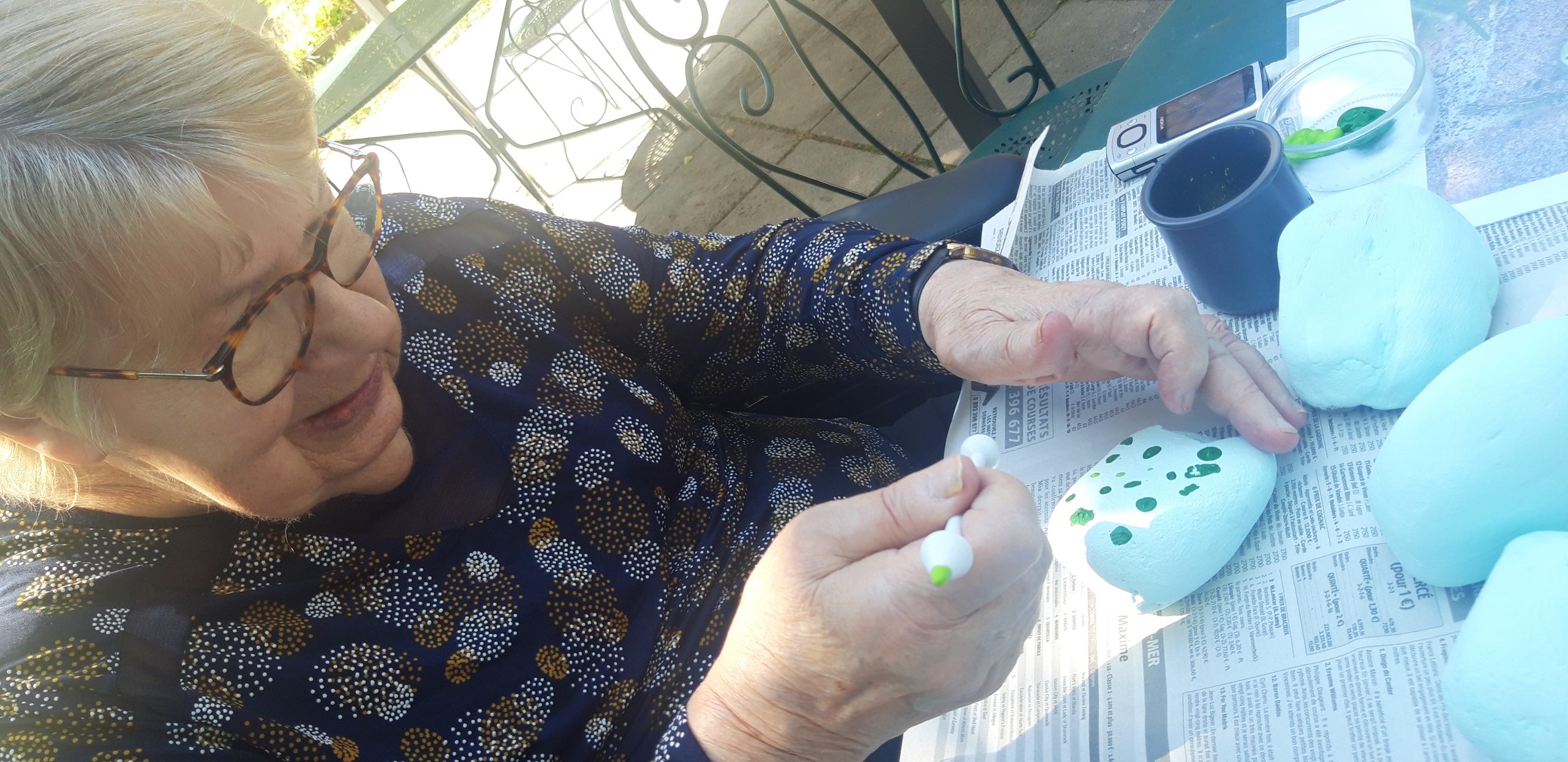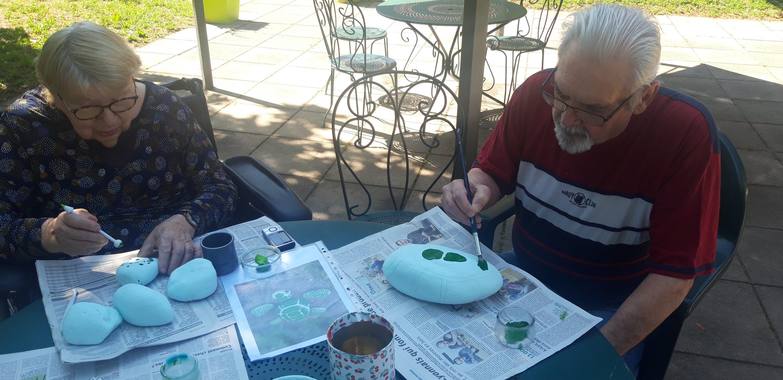 Des matins en co-animation avec l’ergothérapeute sont aussi dédiées aux activités manuelles pour que s’exprime la créativité des résidents à l’ombre des arbres pour profiter des extérieurs avant le repas.