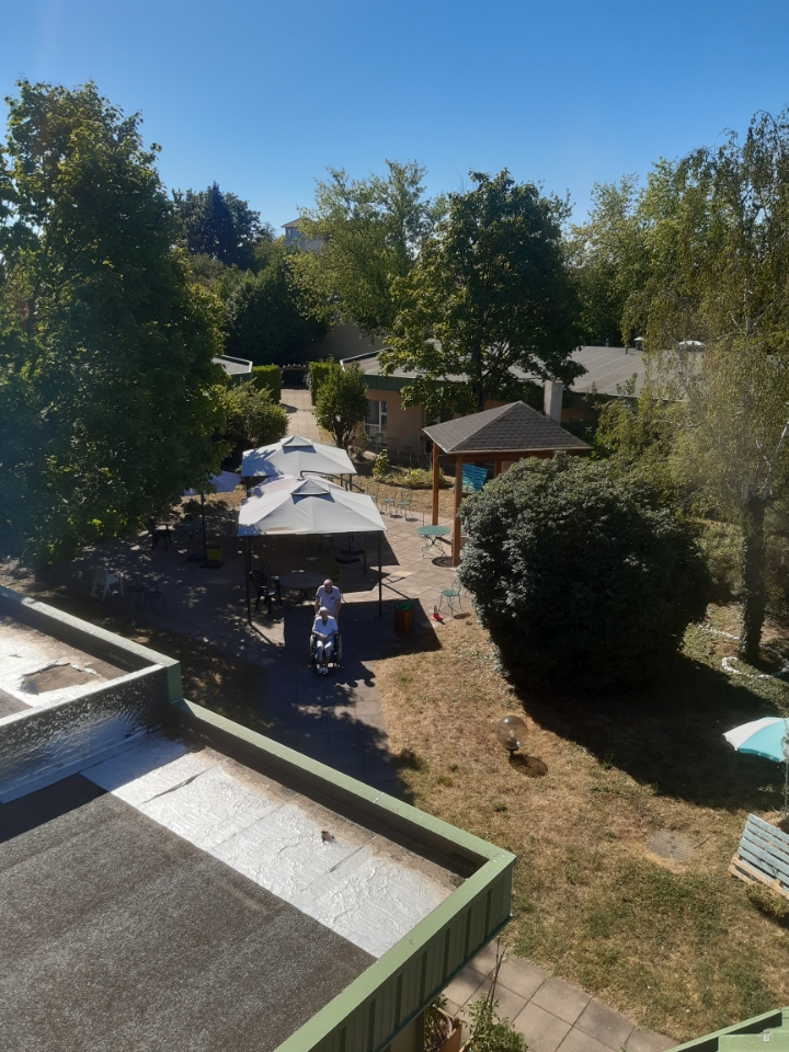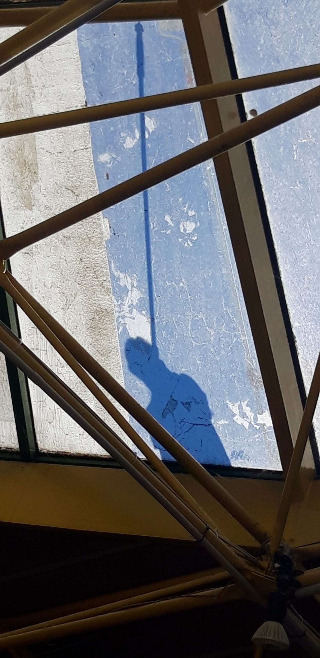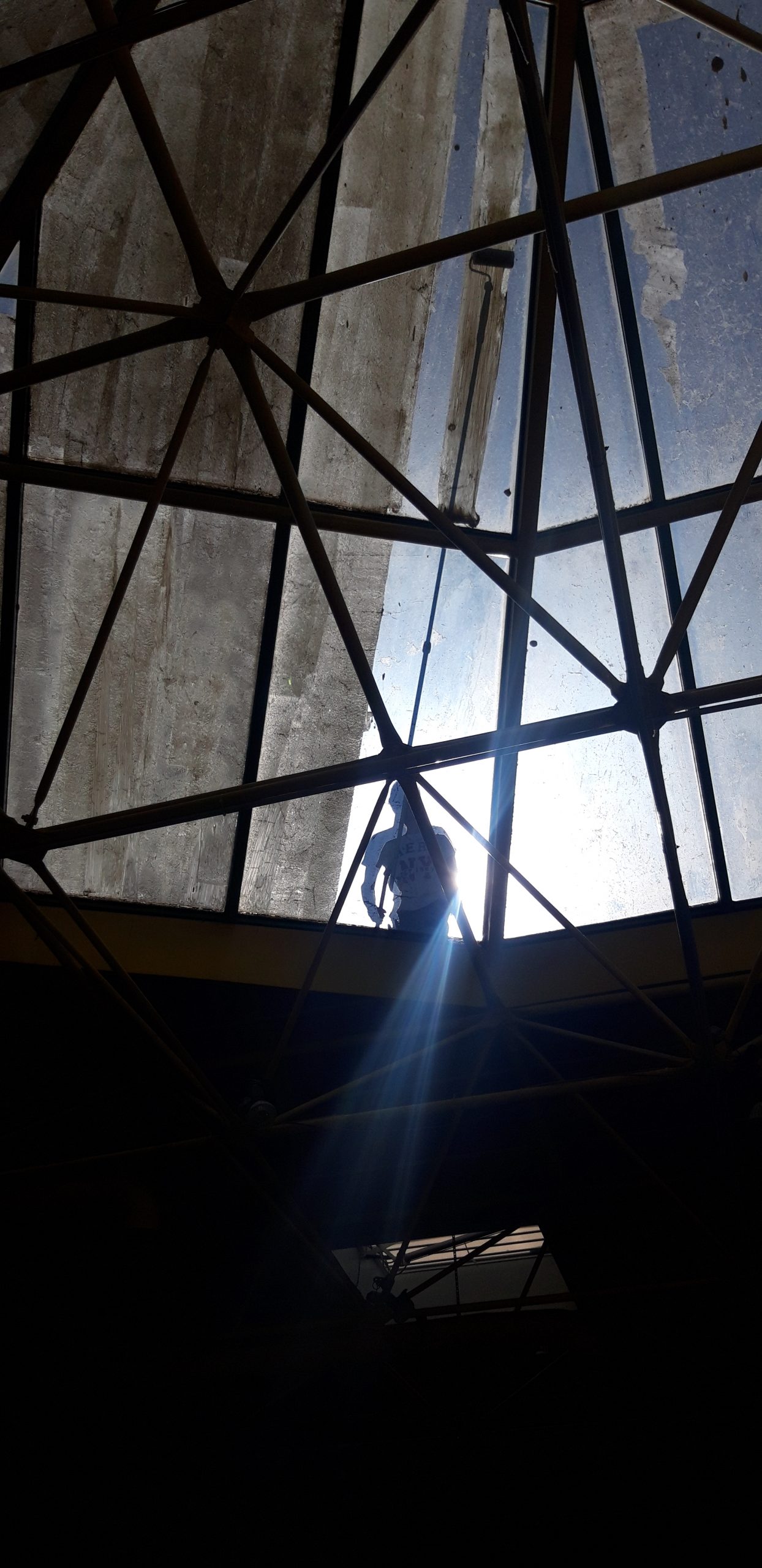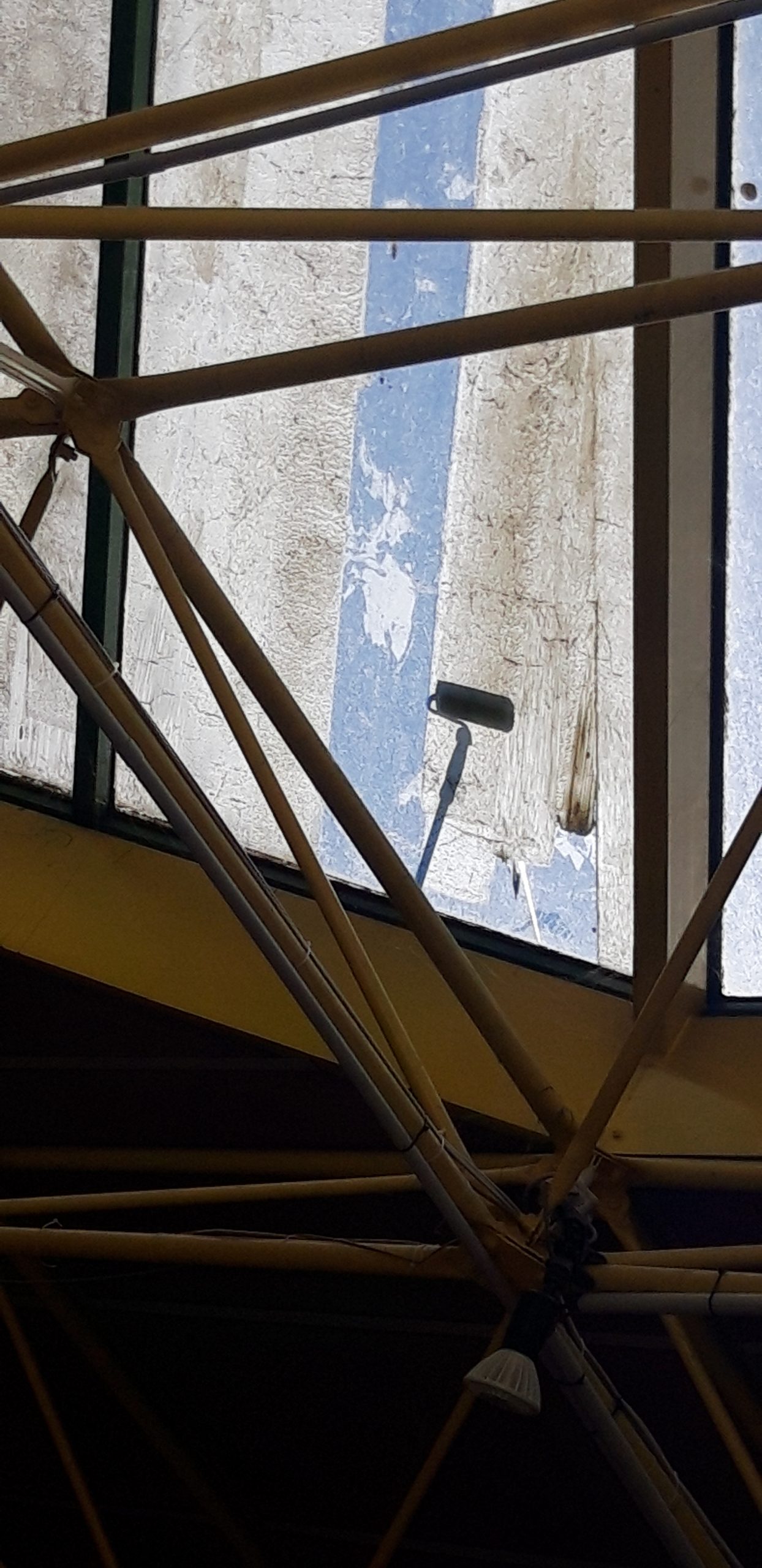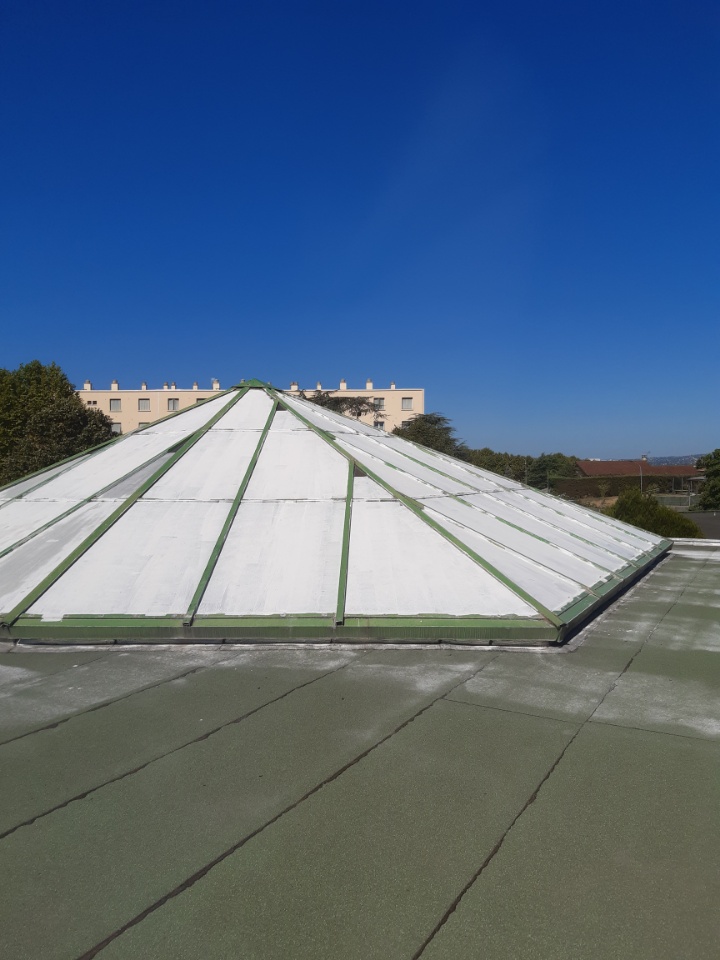 Pour faire descendre la température au sein de l’établissement, notre responsable entretien a grimpé sur le toit. Mais pourquoi faire me direz-vous ??? Afin d’appliquer une couche occultante sur le toit verrière. Ce beau puit de lumière est maintenant atténué par une peinture au Blanc de Meudon. Ce produit naturel s’effacera tout simplement avec la prochaine grosse pluie.