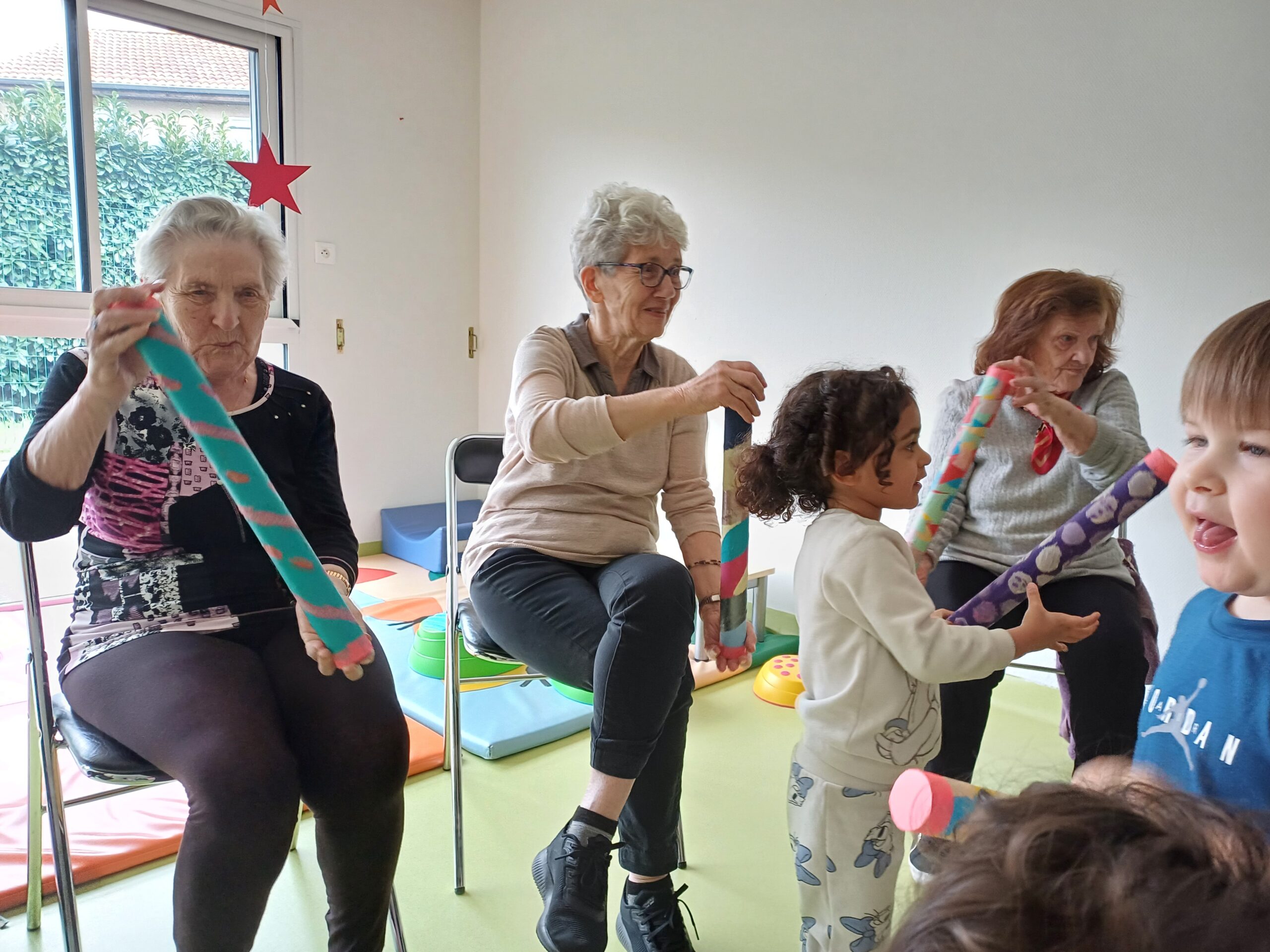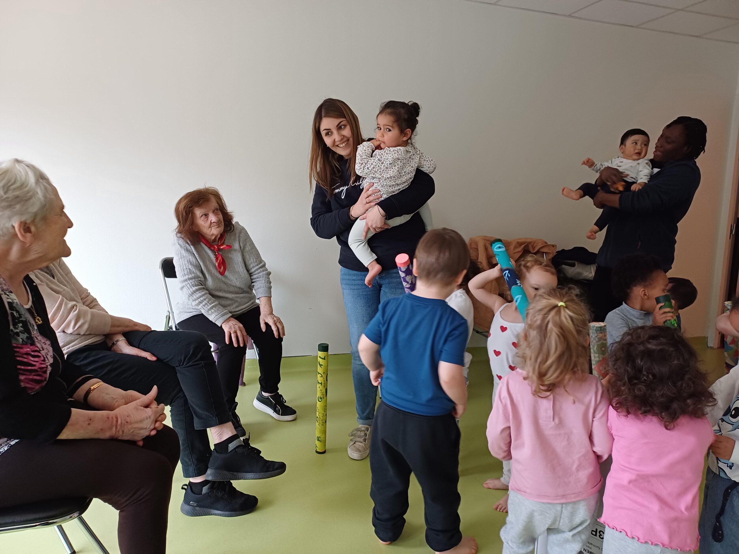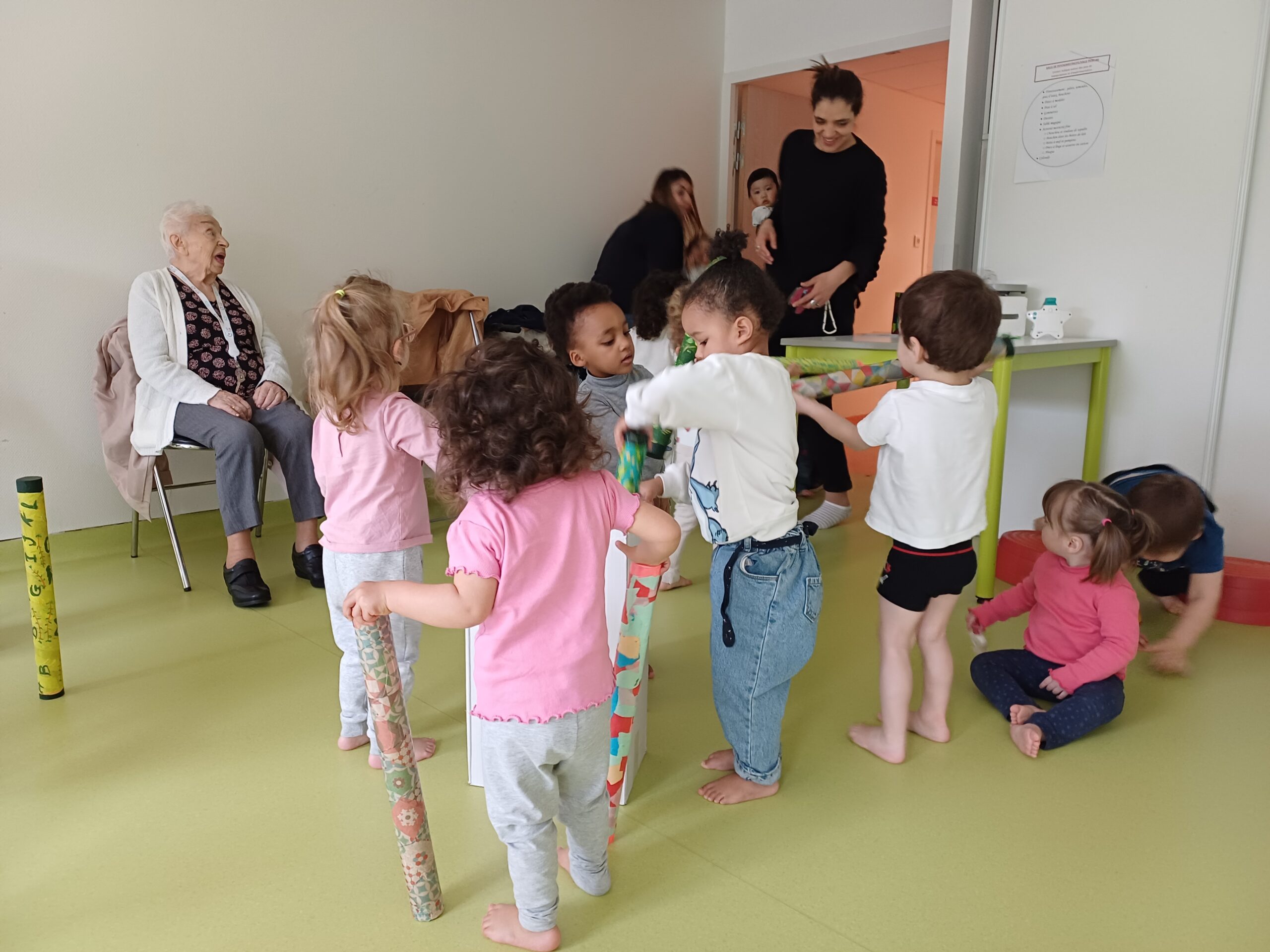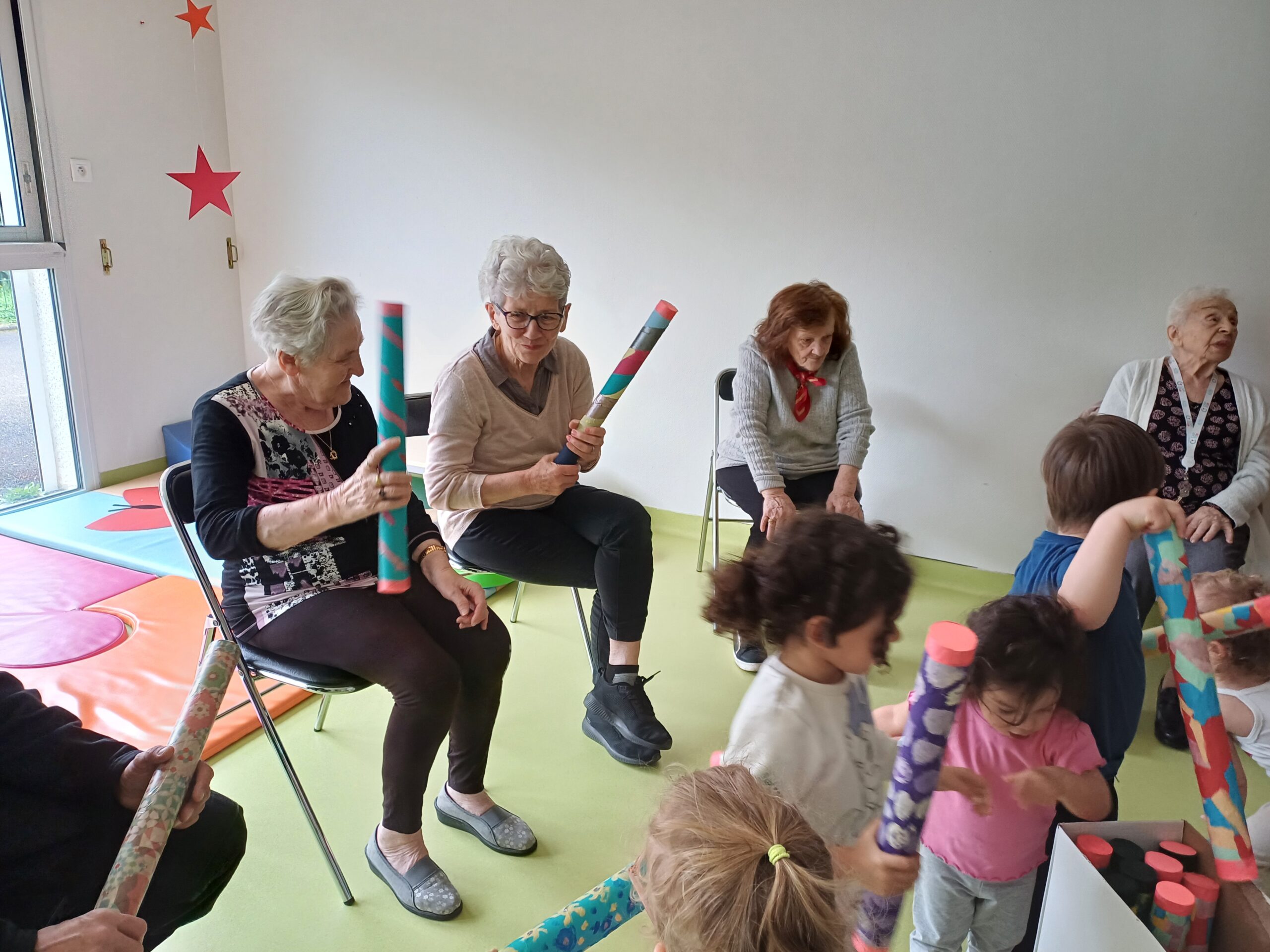 Les résidents sont partis rencontrer les petits de la crèche Ô comme 3 pommes pour leur remettre les bâtons de pluie, fabriqués en atelier créatif.