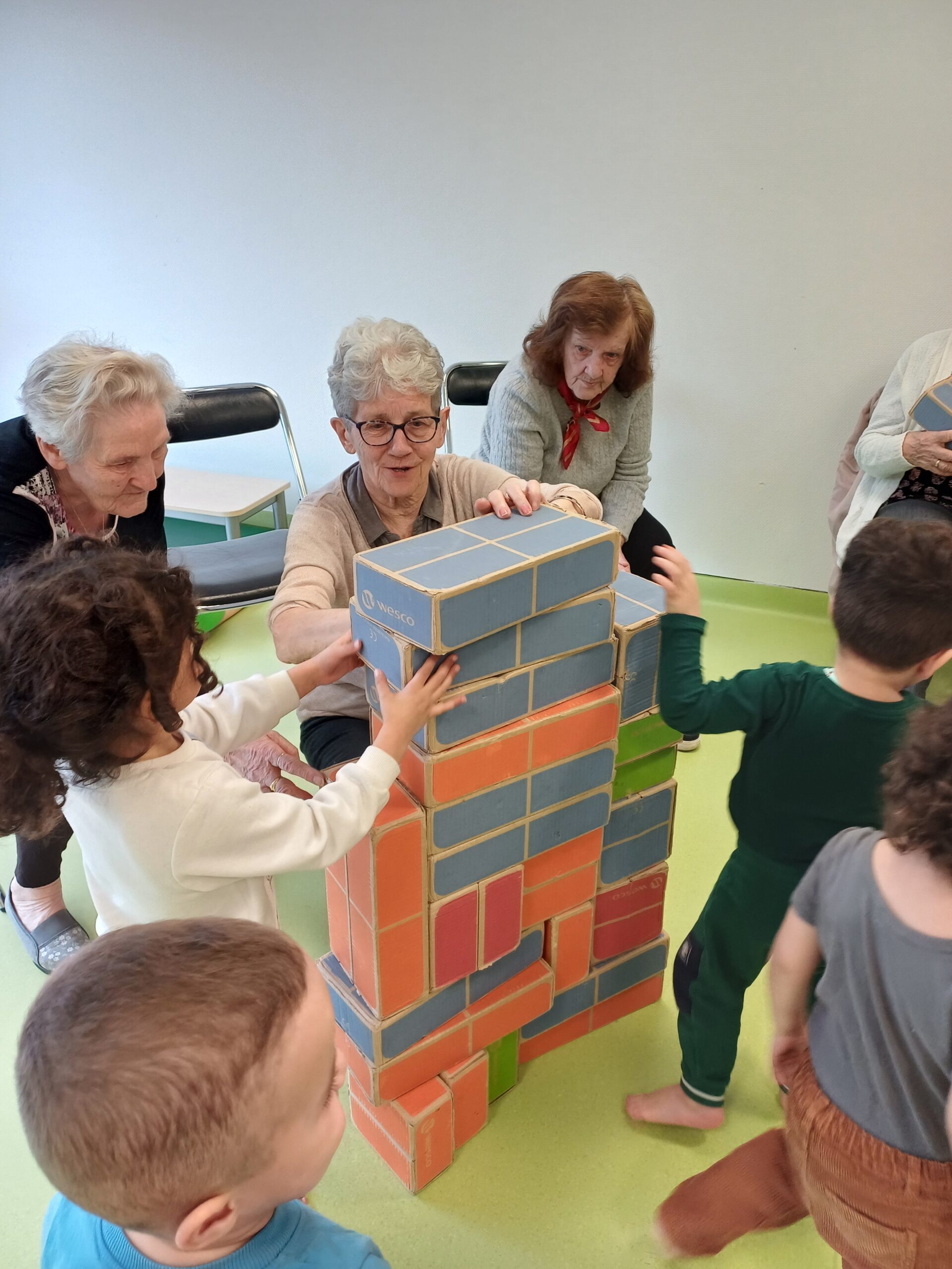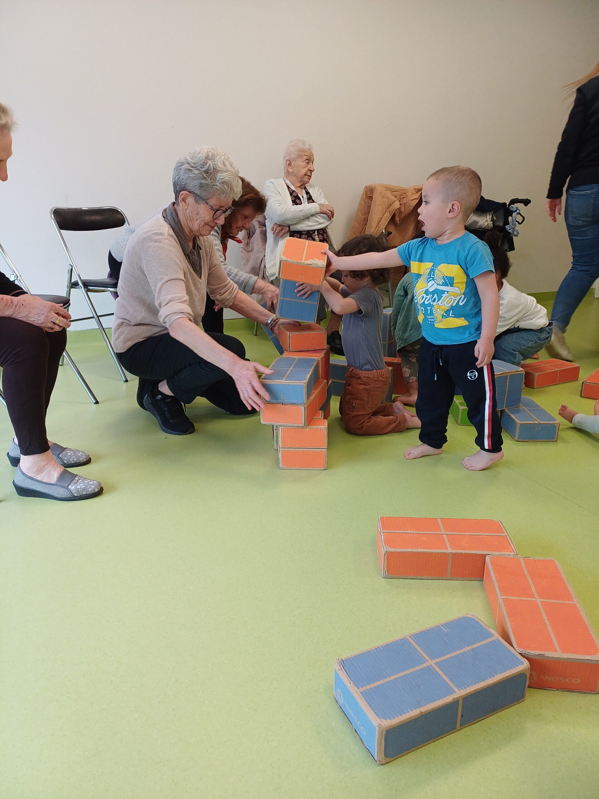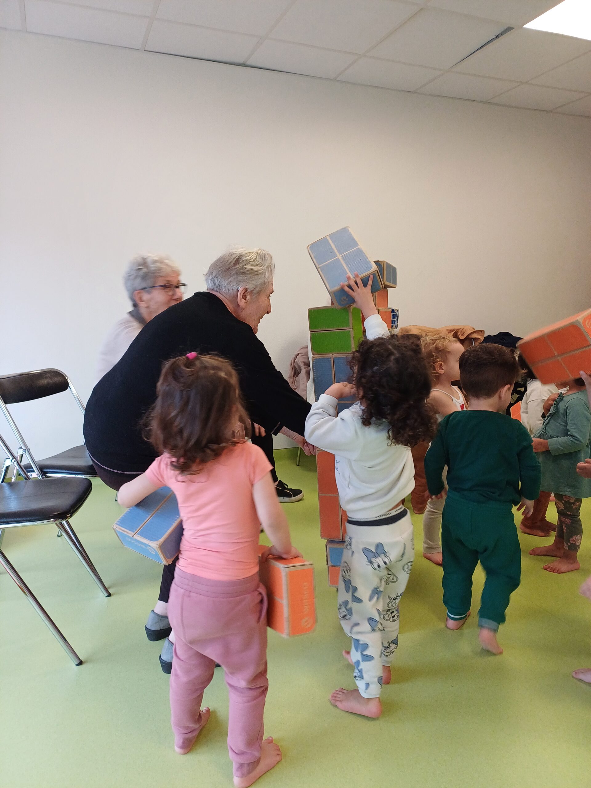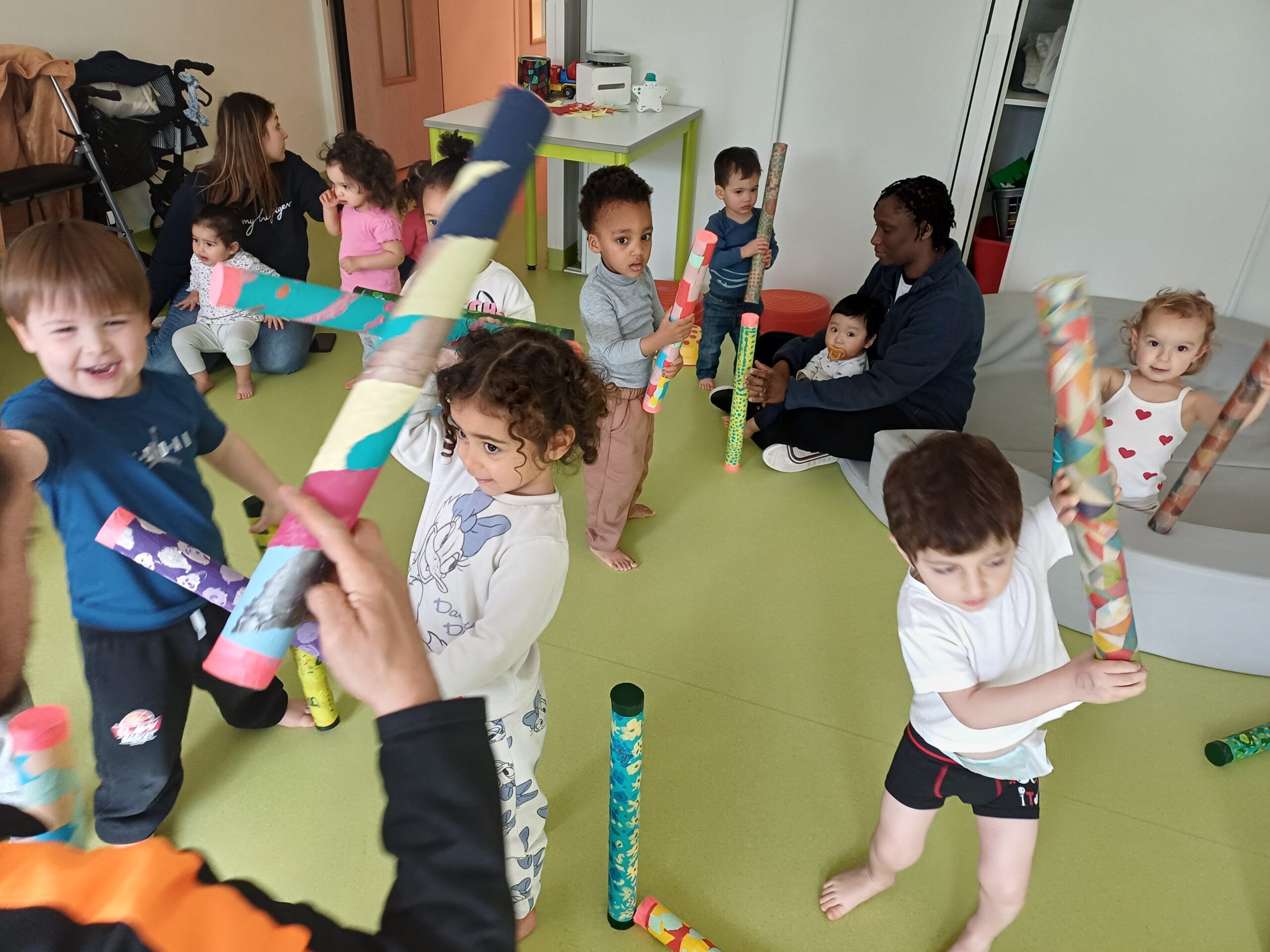 Les résidents sont partis rencontrer les petits de la crèche Ô comme 3 pommes pour leur remettre les bâtons de pluie, fabriqués en atelier créatif.